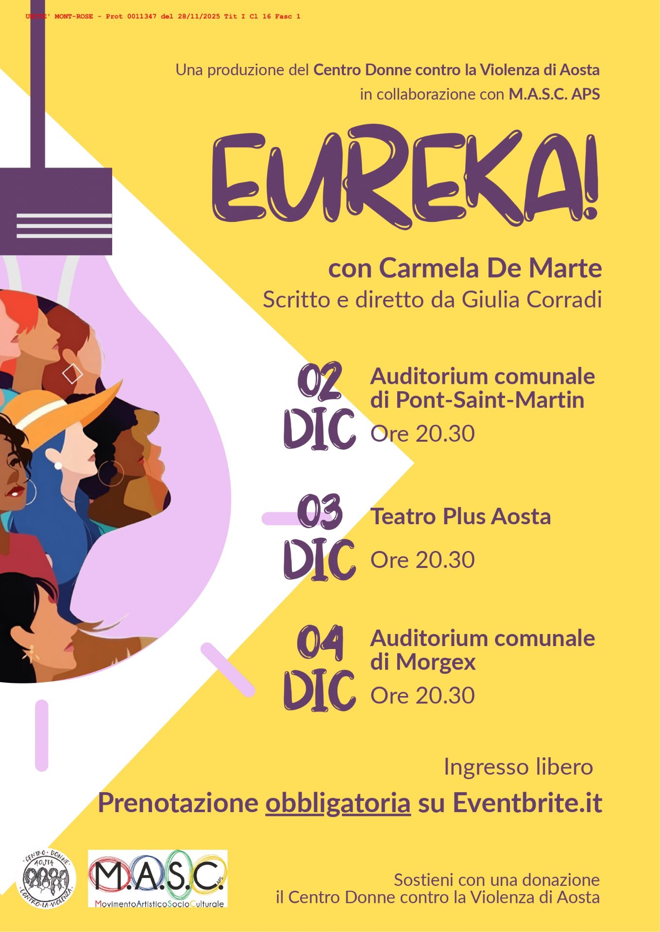 Il Centro Donne contro la Violenza di Aosta, in collaborazione con M.A.S.C. APS, presenta “Eureka!”, uno spettacolo teatrale scritto e diretto da Giulia Corradi e interpretato da Carmela De Marte. Tre repliche aperte al pubblico, a ingresso libero, sono in programma il 2, 3 e 4 dicembre, rispettivamente a Pont-Saint-Martin, Aosta e Morgex.