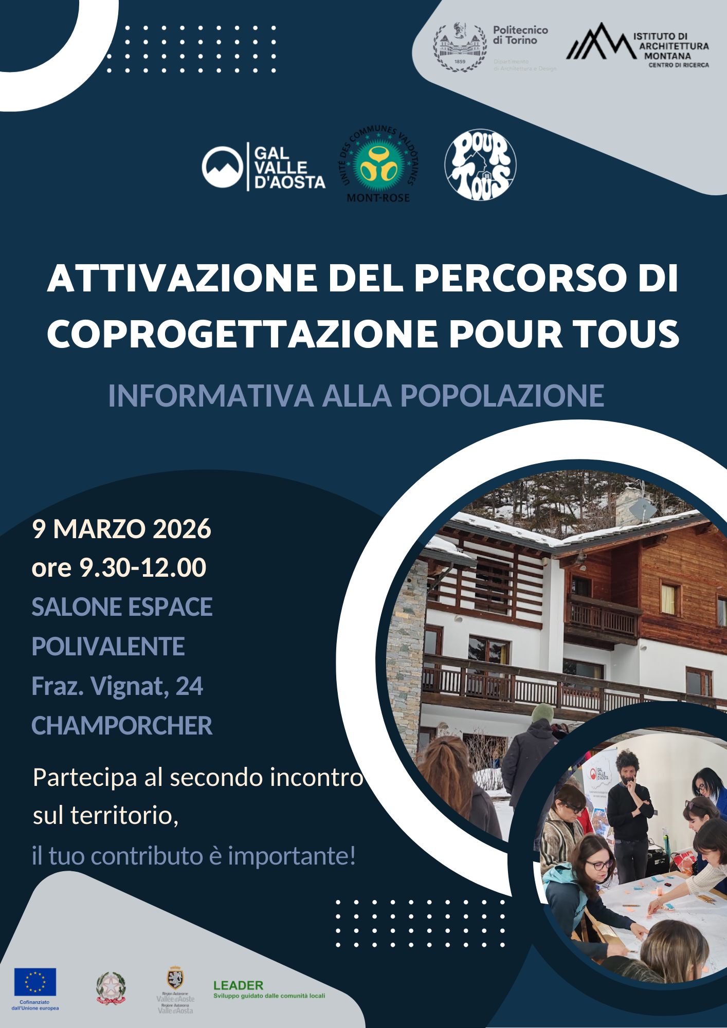 Si svolgerà lunedì 9 marzo 2026 alle ore 9:00 a Cahmporcher il secondo incontro sul territorio del percorso Pour Tous, promosso dal GAL Valle d'Aosta, presso il Salone espace polivalente.
