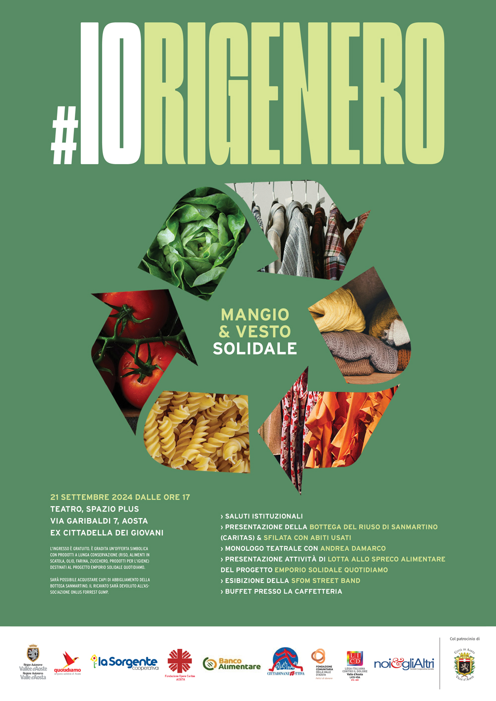 Prende il via il Progetto Emporio Solidale dal titolo “#IORIGENERO, mangio e vesto solidale”, con l'evento in programma sabato 21 settembre 2024 alle ore 17 presso il teatro Spazio Plus di Aosta (ex Cittadella dei giovani).