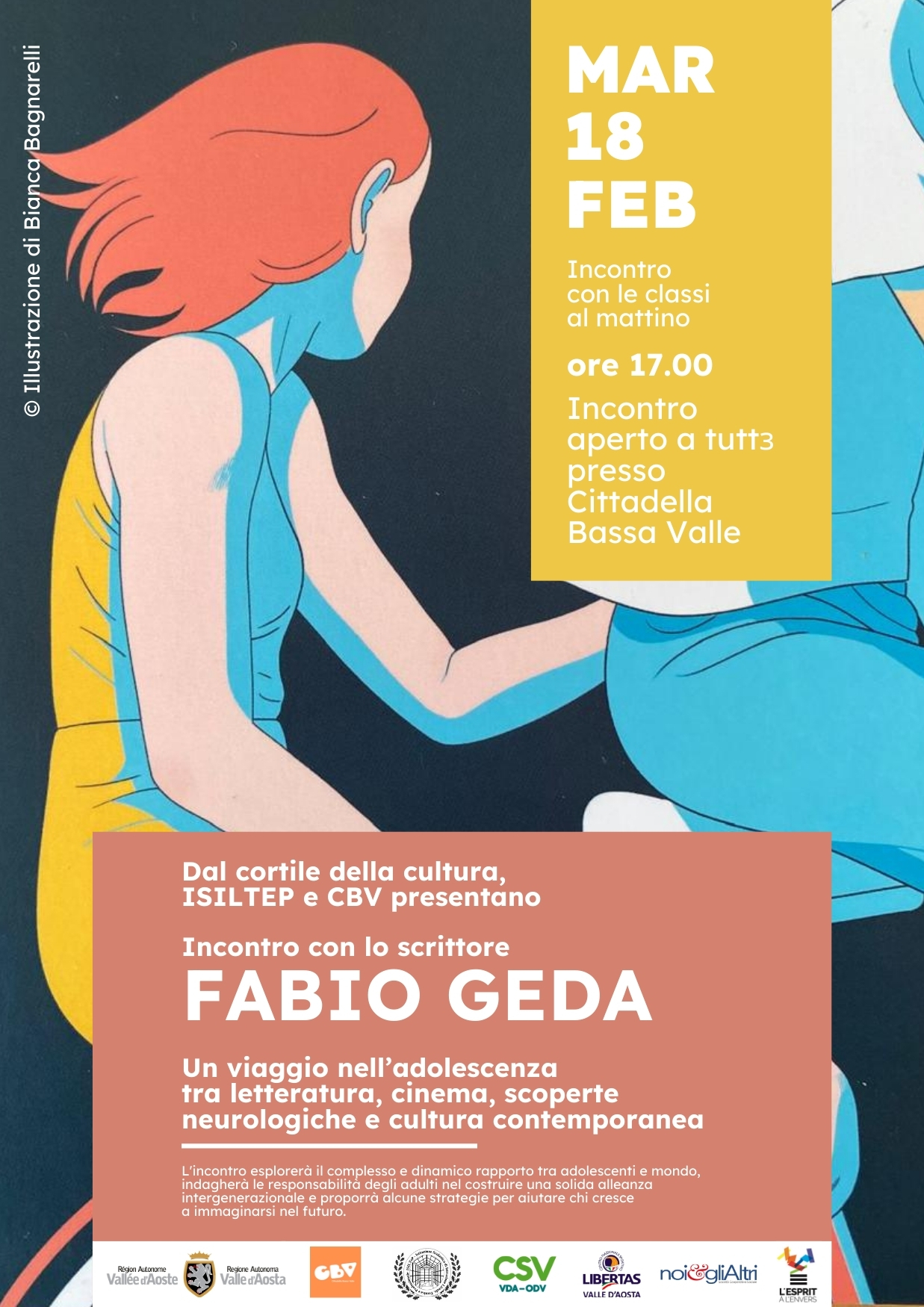 Nell'ambito degli eventi organizzati dall'Isiltep di Verrès e Cittadella Bassa Valle d'Aosta - a cui è stato dato il nome "Tra Isiltep e CBV: il cortile della cultura", martedì 18 febbraio dalle ore 11:40 alle ore 13:20, alcune classi dell'Isiltep incontreranno lo scrittore Fabio Geda, che si confronterà con studentesse e studenti sui libri “Anime scalze” e “L’estate alla fine del secolo”.