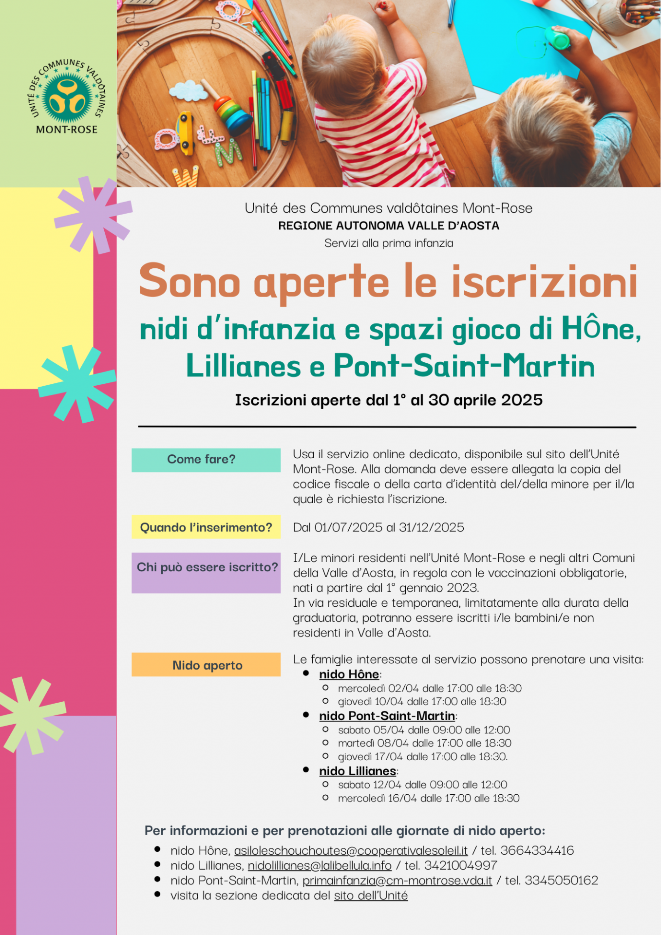 A partire dal 1° aprile 2025 aprono le iscrizioni ai servizi alla prima infanzia gestiti dall'Unité Mont-Rose: i nidi d'infanzia e gli spazi gioco "Les Chouchoutes" di Hône, di Lillianes e di Pont-Saint-Martin.